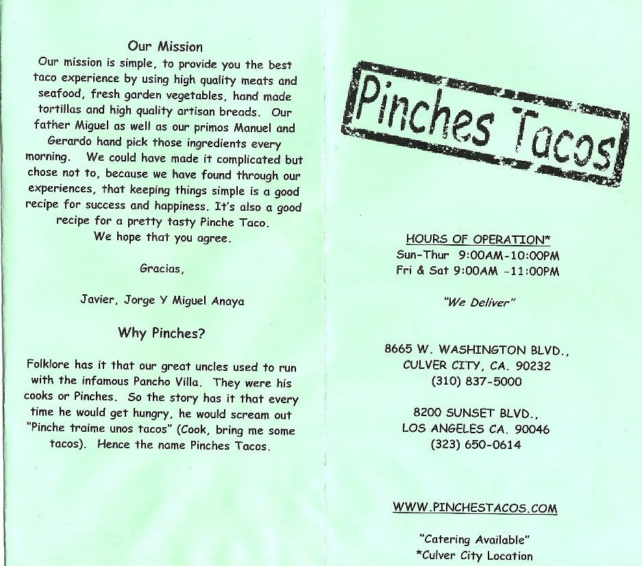 Welcome to Pinches Tacos, a delightful Mexican eatery nestled in Culver City, CA. Known for its vibrant atmosphere and meticulous attention to authentic flavors, Pinches Tacos offers a mouthwatering selection of tacos that cater to every palate. Each taco is crafted with care, featuring options like the savory Asada Taco, tender Pollo al Pastor, and the unique Lengua Taco. For seafood lovers, the Camaron Taco and Pescado Taco shine with fresh, delicious bites.